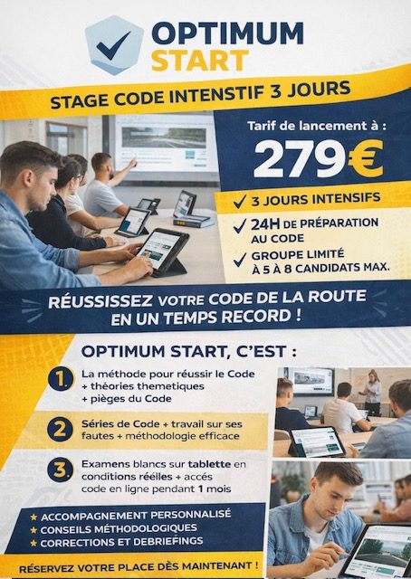 OPTIMUM START est une formule intensive destinée aux candidats souhaitant préparer rapidement leur code de la route.
